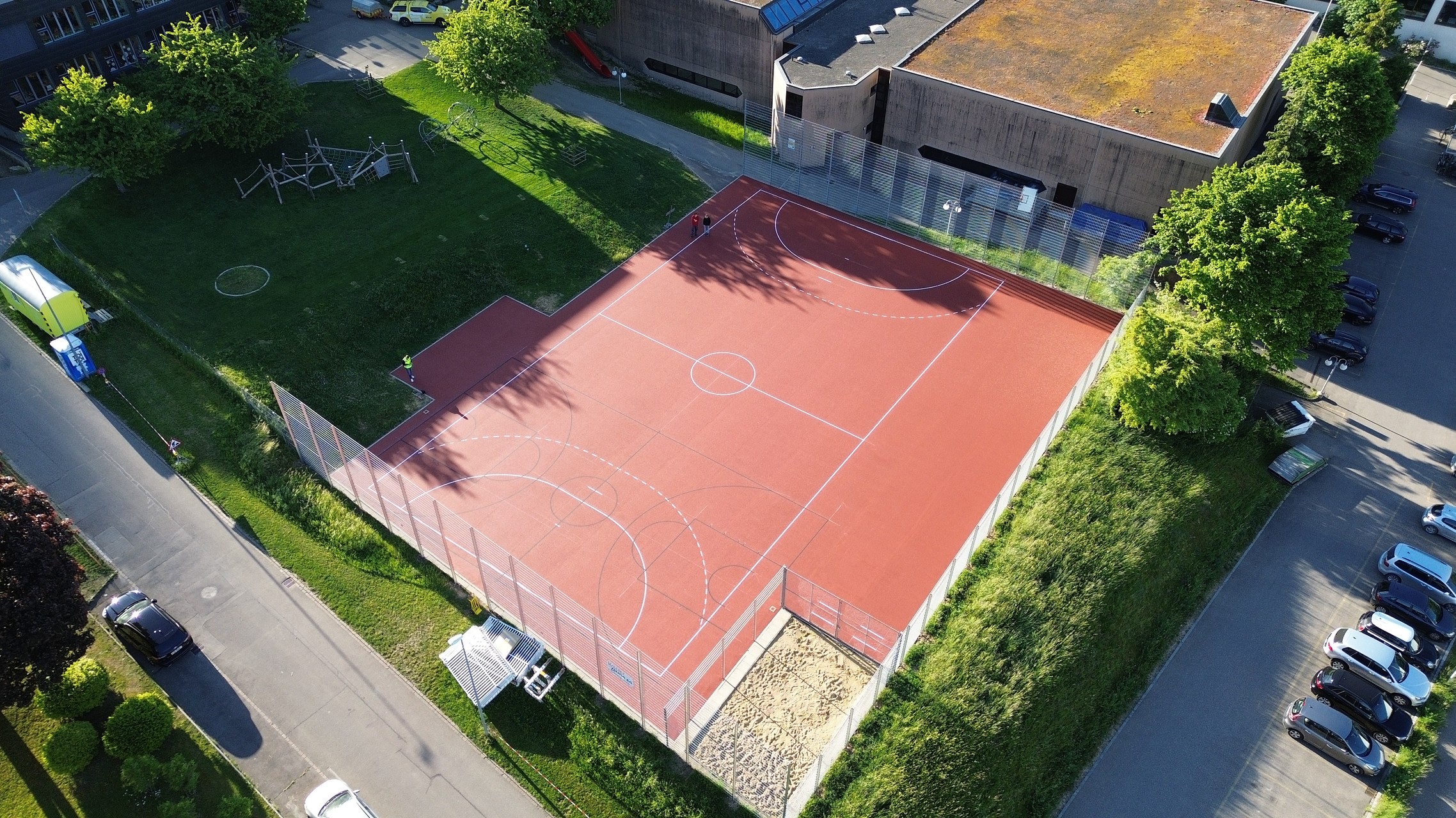 Im ersten Schritt wurde der bestehende Kunststoffbelag entfernt und fachgerecht entsorgt. Anschliessend wurde das System Resotan Paris auf dem bestehenden Sickerasphalt eingebaut. Der Wasserdurchlässige EPDM-Sportbelag erfüllt alle Normen und gewährleistet einen sichereren sowie zu jeder Jahreszeit bespielbare Oberfläche. Die Integrierte Weitsprunganlage lässt der Nutzerschaft viele kreative Spielmöglichkeiten und vereint Leichtathletik, Spiel und Sportarten.