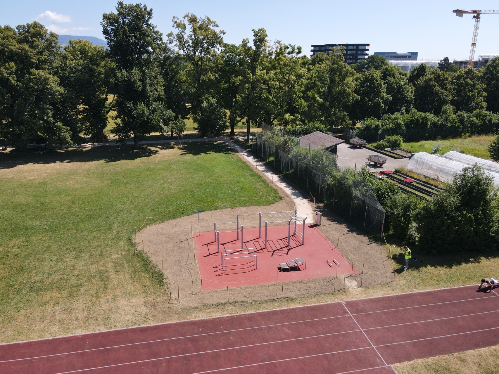Im ersten Schritt wurden die benötigten Vorarbeiten wie Erstellen einer Kieskofferung, versetzen von Randabschlüsse und das Erstellen von Fundamenten ausgeführt. Als Fallschutzbelag wurde das System Resotan BioLast gewählt. Dieser EPDM-Bodenbelag bietet eine hohe Stossdämpfung und erfüllt die Sicherheitsanforderungen für öffentliche Fitnessanlagen. Die Oberfläche ist rutschfest und gewährleistet somit eine sichere Nutzung.