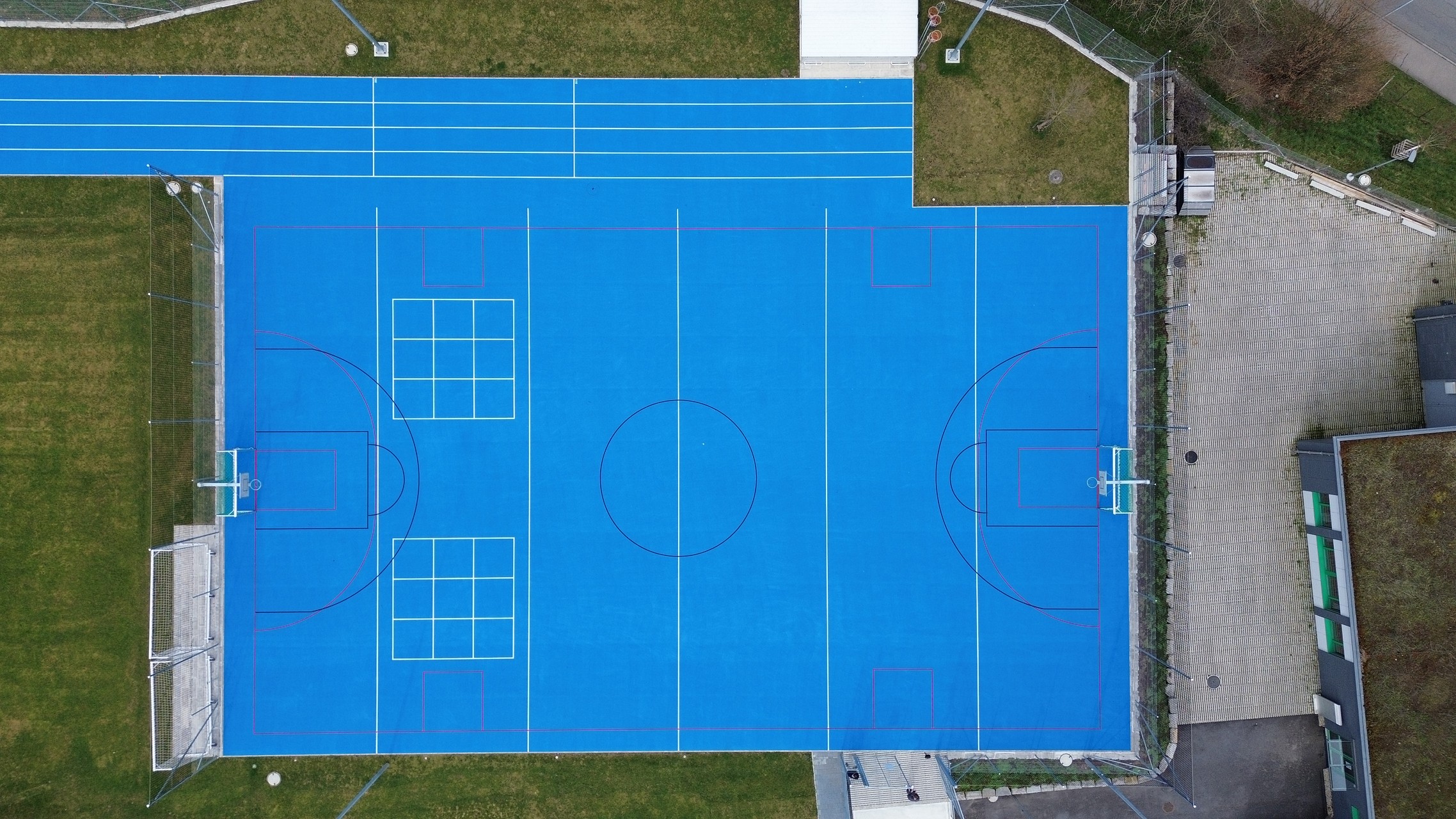 Die neuen Beläge wurden in einem modernen Blauton ausgeführt, der der Anlage nicht nur eine frische und dynamische Optik verleiht, sondern sie zugleich zu einem echten Schmuckstück für Schule und Gemeinde macht.