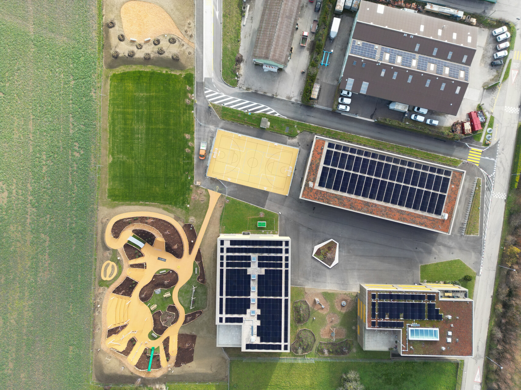 Realsport a été mandaté pour les aménagements extérieurs et ludiques du nouveau Collège de Féchy. Tout son savoir-faire a été mis à l’œuvre tant pour la réalisation d’ilot en béton coulé sur place aux formes géométriques spécifiques, que pour la création d’un terrain multisport, la réalisation d’une aire engazonnée pour permettre aux enfants de se défouler, d’un verger et potager pour enseigner pédagogiquement sur les choses qui poussent ainsi qu’une aire de jeux ludico sportive destinée à explorer et tester en s’amusant. Cette aire de jeux réalisée avec des jeux inclusifs permet aux utilisateurs de l’école ainsi que du village de trouver en cet endroit un espace de détente pour se rencontrer et laisser les enfants évoluer en toute sécurité. La place de jeux a été agrémentée d’un point d’eau pour se rafraîchir. Une attention particulière a été portée aux plantations pour favoriser l’ombrage et la diversité biologique sur le site. De nombreux arbustes à petits fruits ont également été répartis autour de la place pour que les enfants puissent se servir librement en jouant.