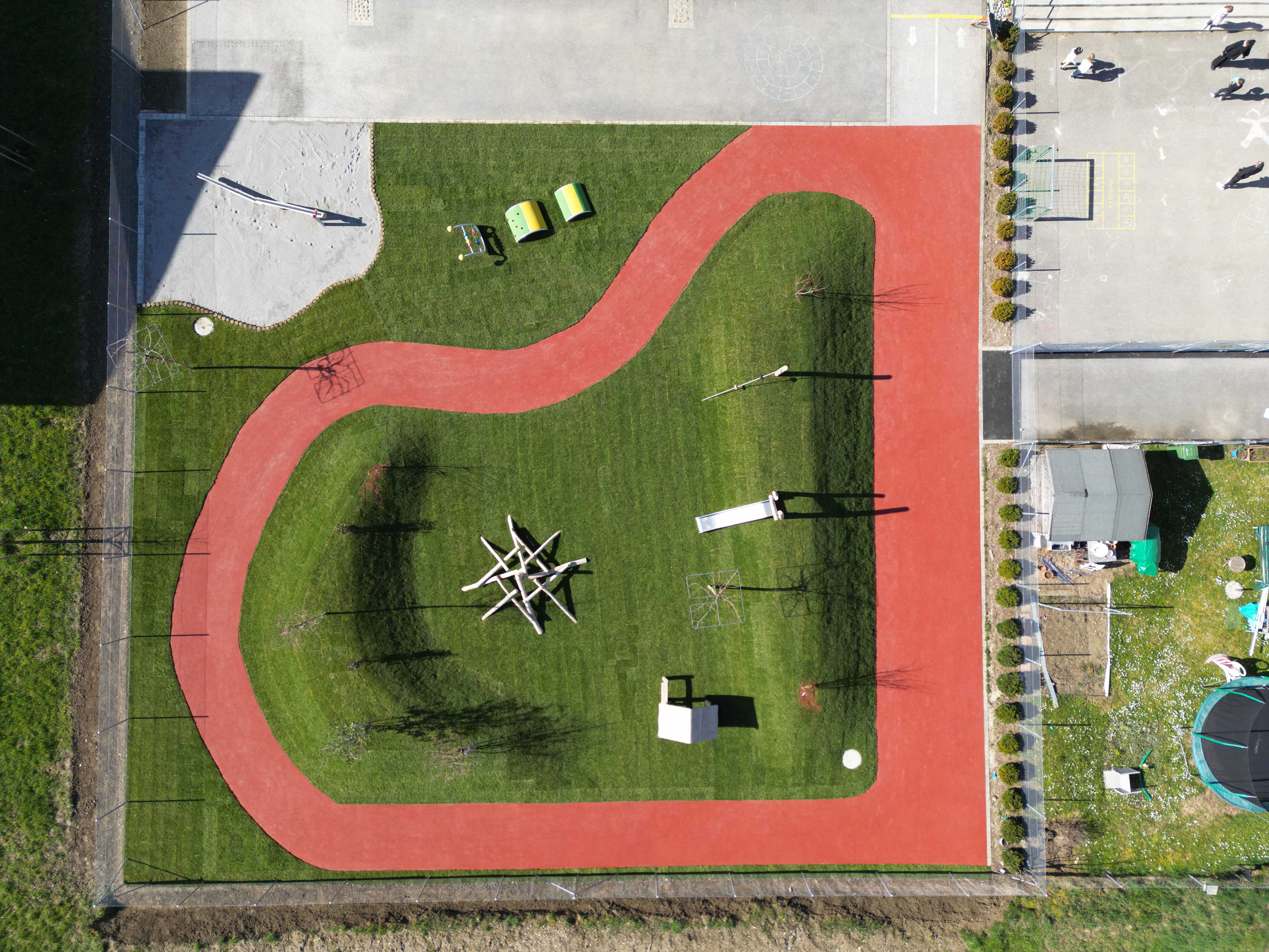 Réalisation d’une place de jeux et zones de détentes pour les enfants de la crèche. Après la réalisation d’un projet d’aménagements ludique par notre bureau d’étude, nous avons planifié la rénovation complète de l’aire de jeux du CVER à Colombier VD. D’importants travaux de terrassement et l’apport de terre végétale ont permis d’améliorer la qualité du sol et de façonner des buttes paysagères, pour la biodiversité et le jeu. Des engins de jeux pour petits et grands ont été installé dans la partie centrale et sur les buttes. Ces dernières ainsi que la partie centrale de la pelouse ont été réalisés avec un gazon hybride renforcé pour résister à la force sollicitation des espaces de jeux. Un nouveau parcours trotteur, réalisé avec un revêtement sportif coulé, silionne le site et permet aux petits de déambuler en toute sécurité. A l’entrée du site, un jeu d’eau et une fosse sable offre un espace de jeu créatif. Finalement des arbres viennent apporter de l’ombrage et de la fraîcheur pour les chaudes journées d’été.